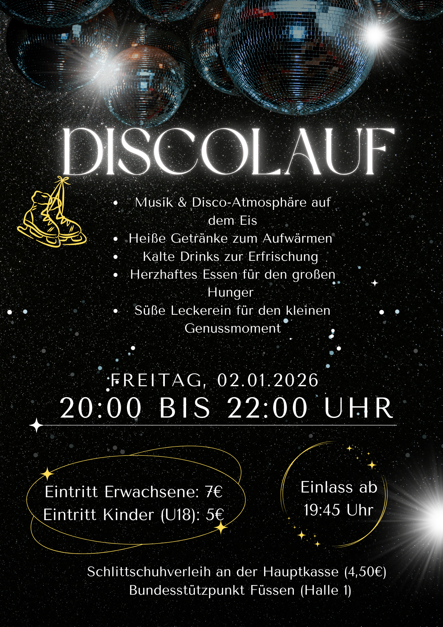 Discolauf Musik & Disco-Atmosphäre auf dem Eis Heiße Getränke zum Aufwärmen Kalte Drinks zur Erfrischung Herzhaftes Essen für den großen Hunger Süße Leckereien für den kleinen Genussmoment Freitag, 02.01.2026 20:00 Bis 22:00 Uhr Eintritt Erwachsene: 7€ Eintritt Kinder (U18): 5€ |